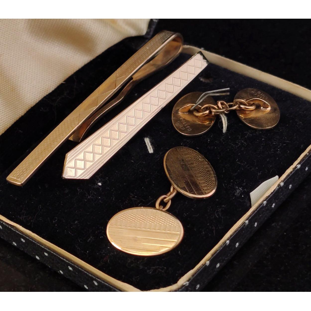 Interesting rolled gold cufflinks and two tie clips. All in good order.