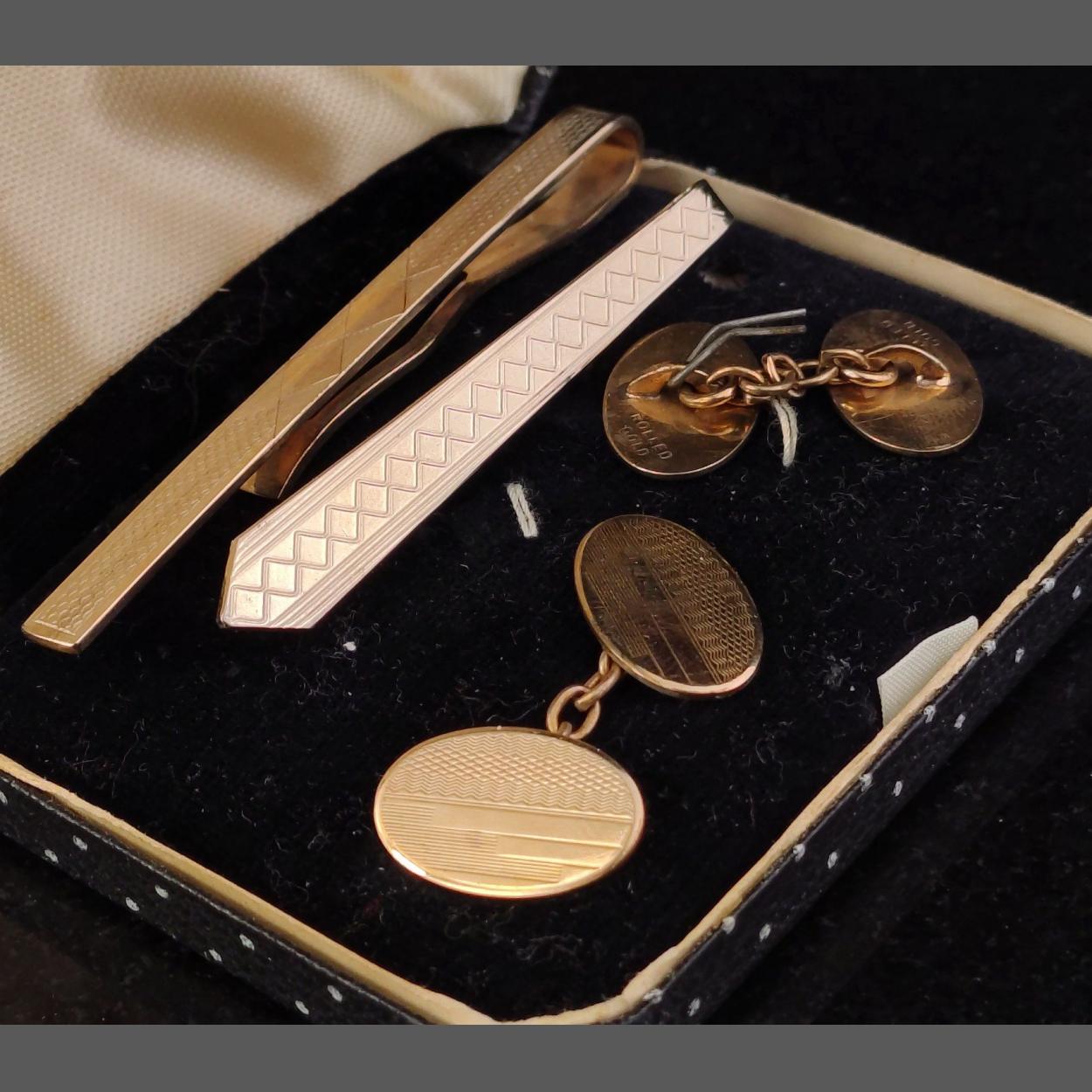 Interesting rolled gold cufflinks and two tie clips. All in good order.