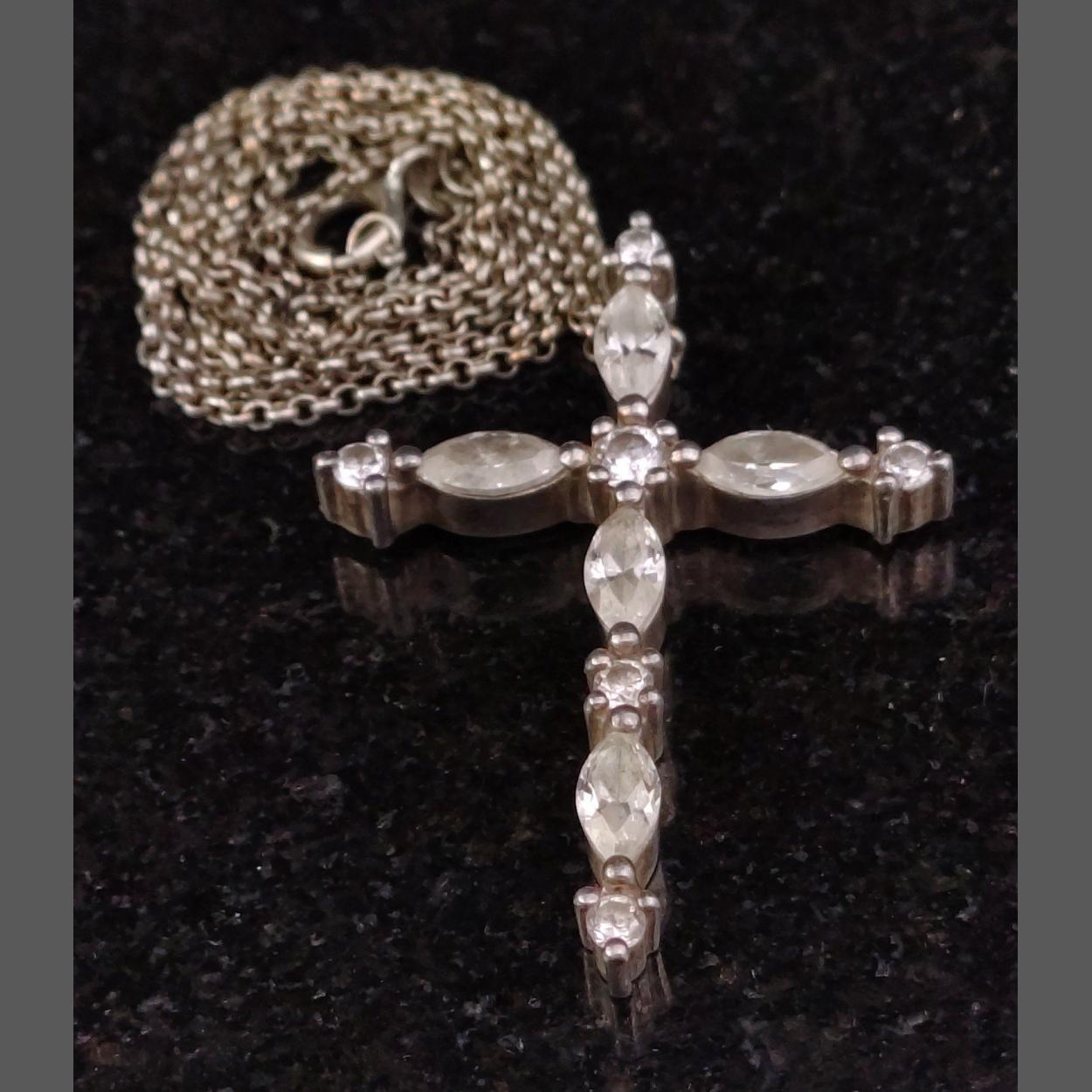 A PRETTY 925 stamped silver cross pendant with white stones on an unmarked white metal chain 7.86g gross approx