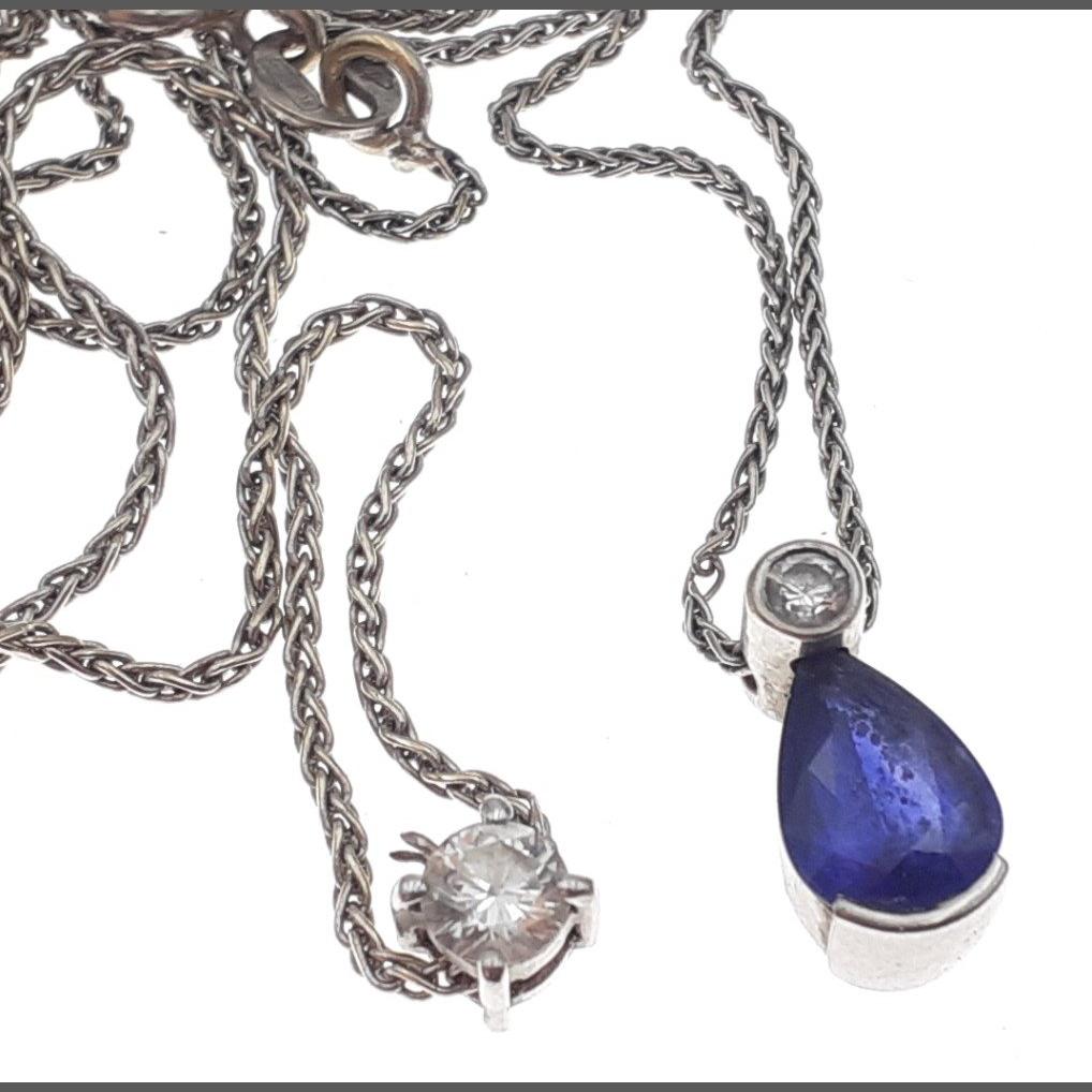 HAMILTON & INCHES purchased DIAMOND & SAPPHIRE pendant on unmarked white metal with a stamped 750 chain gross weight 3.19g incl the chain. Also, an unmarked DIAMOND (tested) 3mm diameter pendant on a 750 white gold chain - gross weight 2.82g approx