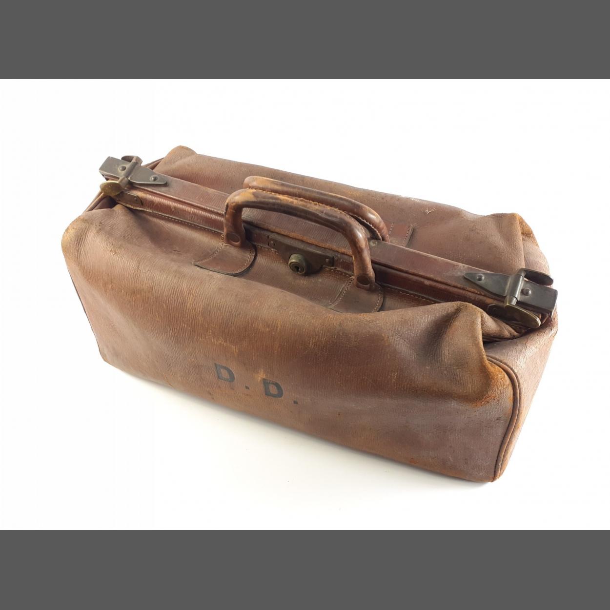 A large leather GLADSTONE BAG. D.D. Initials stamped on front. 50cm wide approx. Clasps work well, light wear to leather, handles intact.