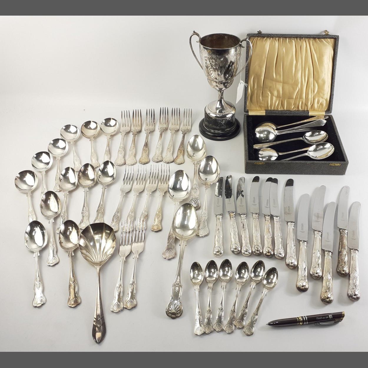 A good quantity of plated EPNS flatware in a box with a plated trophy.