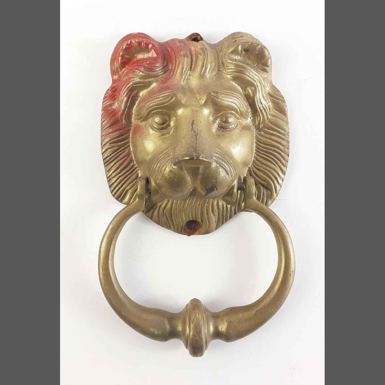 A LIONS HEAD brass door knocker. 11cm across approx. Some red overpaint.
