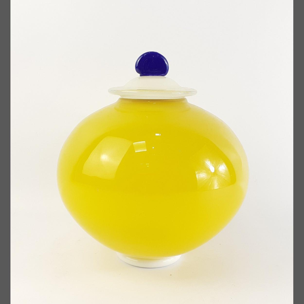 LINDEAN MILL white and yellow glass lidded jar . Stands 18cm approx and in good undamaged condition.