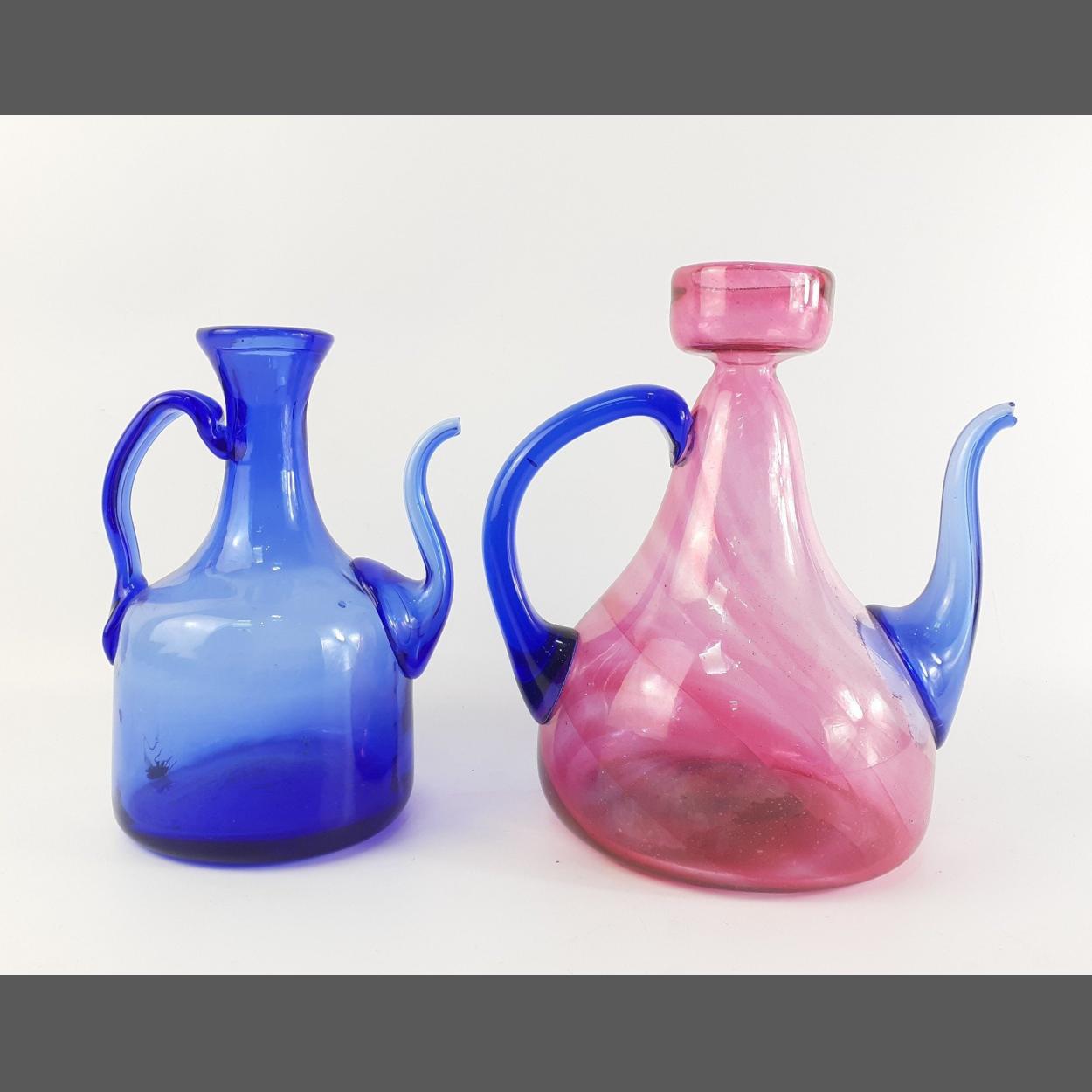 Two art glass tea pot style vases. Pretty and attractive. The larger standing 20cm approx.