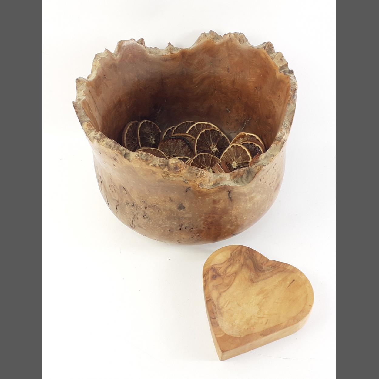 A large burr-elm fruit bowl H18 x diameter 25cm approx. With turned heart-shaped trinket dish (13cm approx)