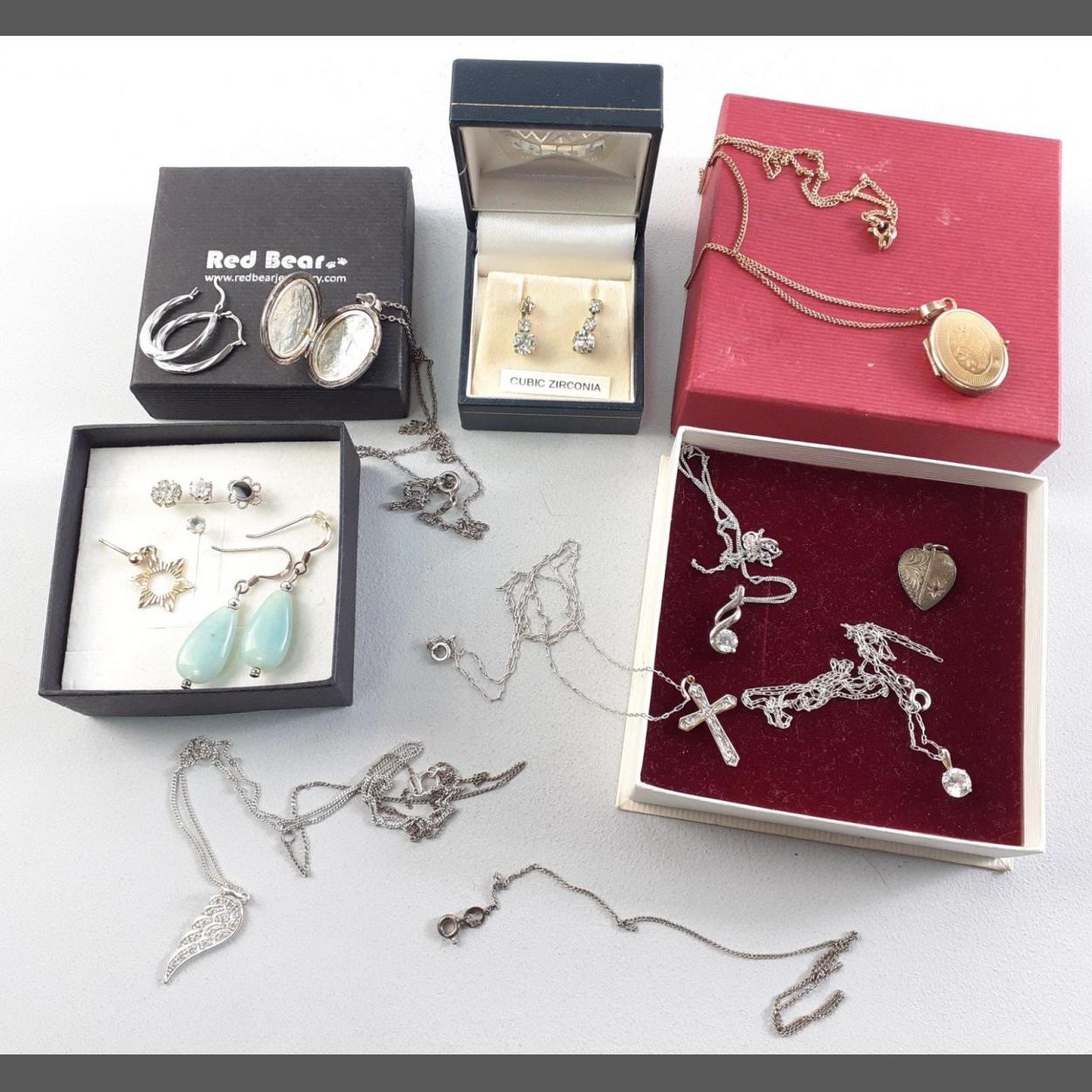 A small collection of silver and other jewellery items to include four silver pendants one with broken chain. With also a rolled gold locket and others.
