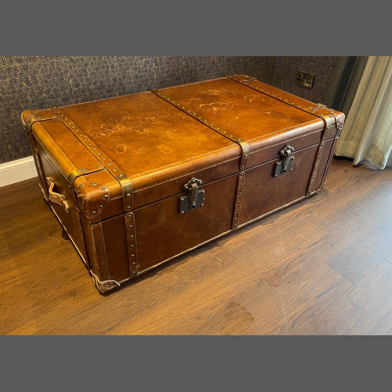 A large LEATHER-BOUND trunk (decorative item) used as a coffee table for a lounge - this is a QUALITY piece - dimensions 120cm width x 70cm depth x 45cm height approx