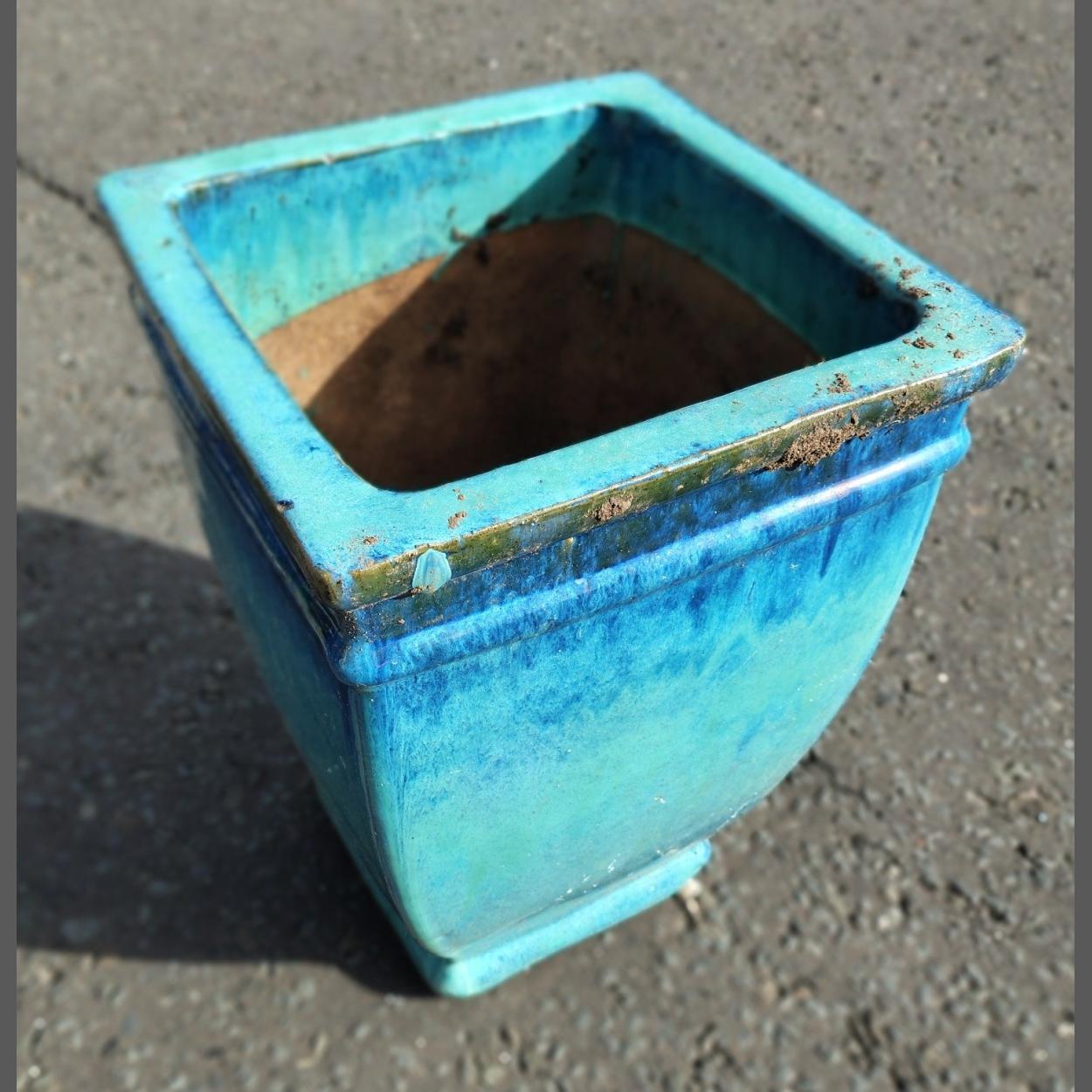 CERAMIC blue glazed garden container - 45cm square x height 34cm approx - a BIG POT!