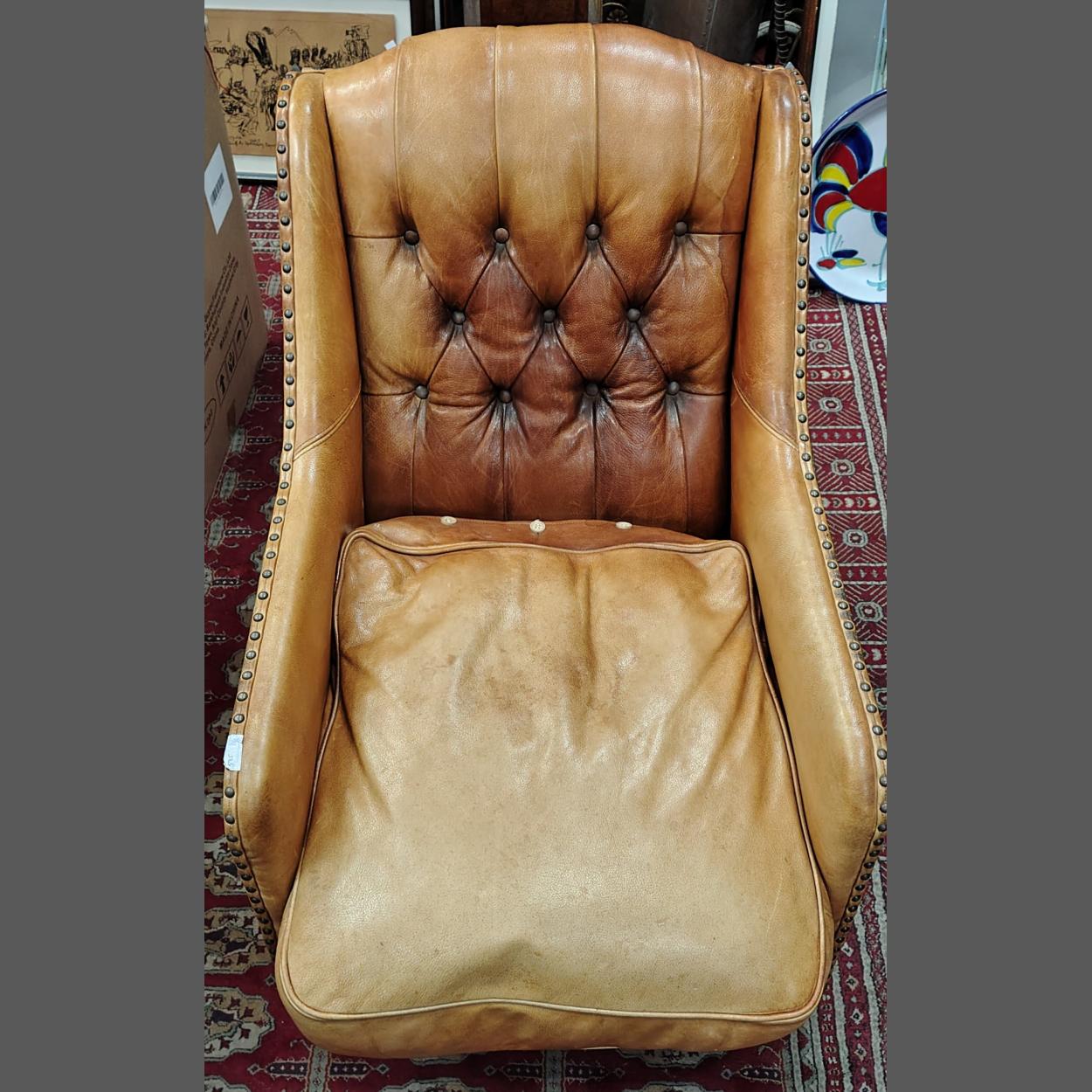 WHAT A PATINA! - A CHARACTER CHAIR! A tan-leather deep buttoned armchair - extremely comfortable - the cushion seat requires some repair at the back zip