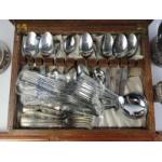 A collection of silver plated items to include candelabra, rose vases, and a canteen of cutlery in a box. With some copper engravings.