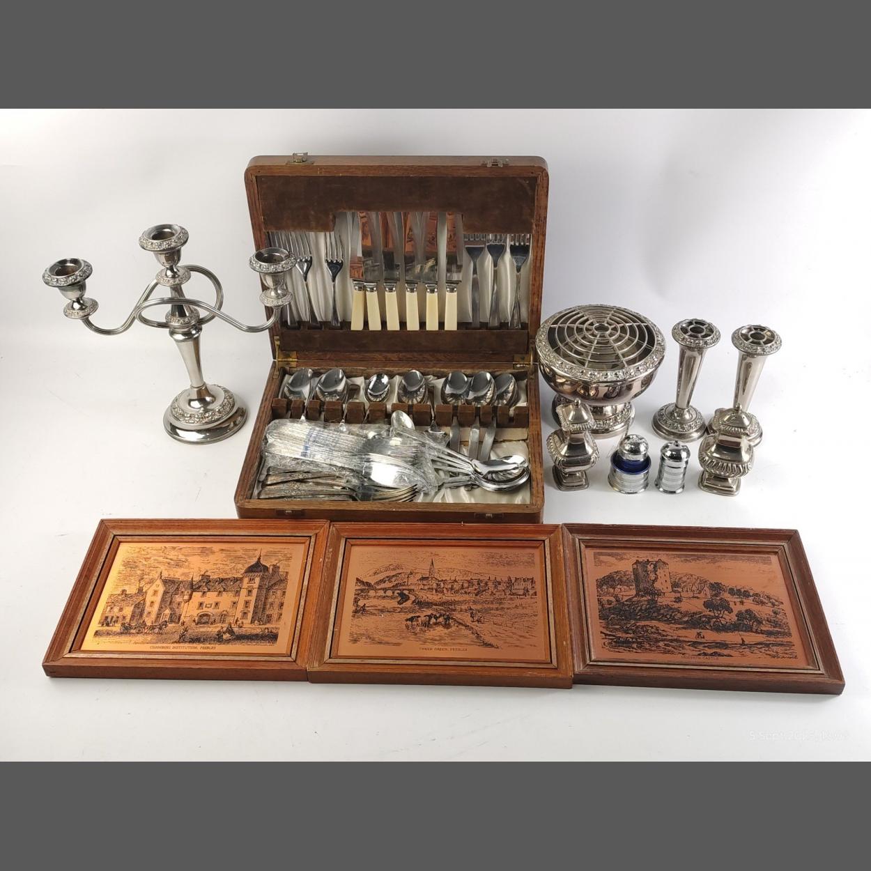 A collection of silver plated items to include candelabra, rose vases, and a canteen of cutlery in a box. With some copper engravings.