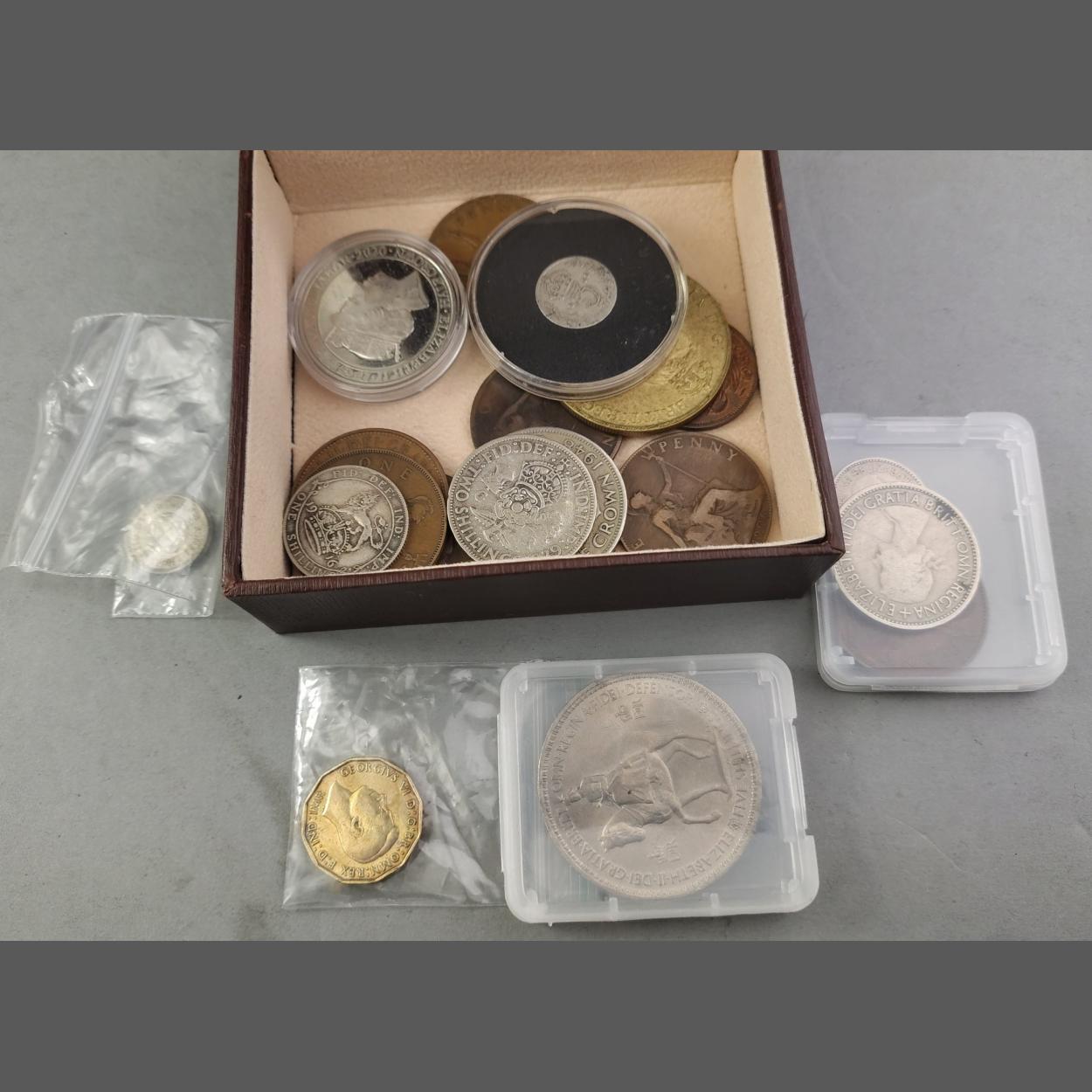 A small collection of coins of interest to include four small UK coins with silver content, a possibly reproduction 1891 Crown and others