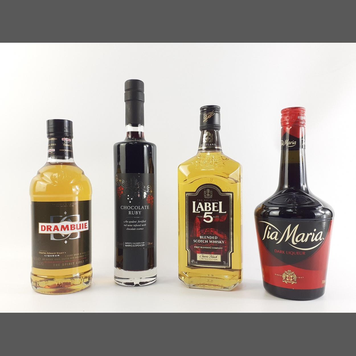 A good night in! A 700ml bottle of DRAMBUIE, a 70cl LABEL 5, Tia Maria and a 50cl Chocolate Ruby