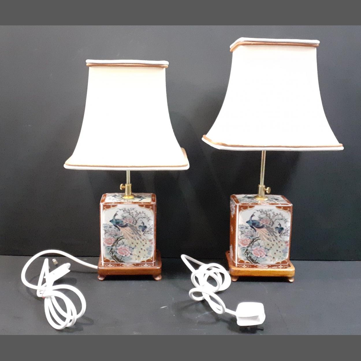 Pair of Oriental style table lamps with peacock design. Height to base of brass stem: 20cm approx. Shade is adjustable
