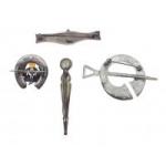 Small Scottish jewellery collection to include small silver dagger pin with silver hallmarks 5cm, a Longship brooch with hallmarks 5cm, Horseshoe brooch with inset hardstones 2cm and an annular brooch with fixed pin. Four lovely pieces. Gross weight 26.5g approx.