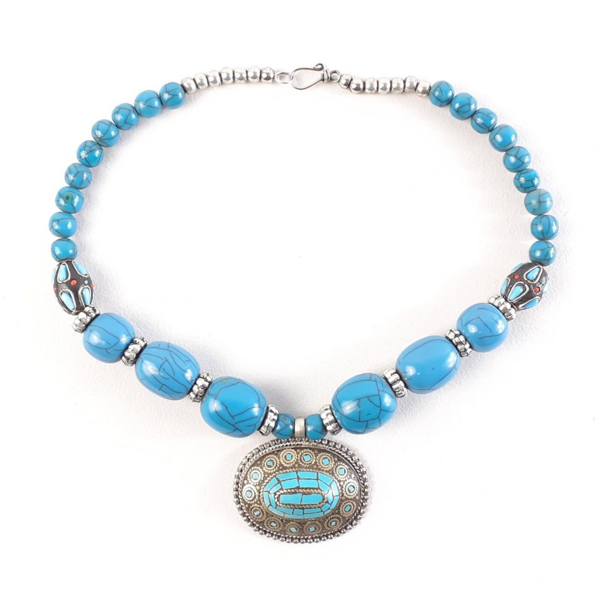 Turquoise bead and pendant necklace. Unmarked but beautiful design and an appealing piece. 46cm approx necklace, pendant is a hefty 5cm across.
