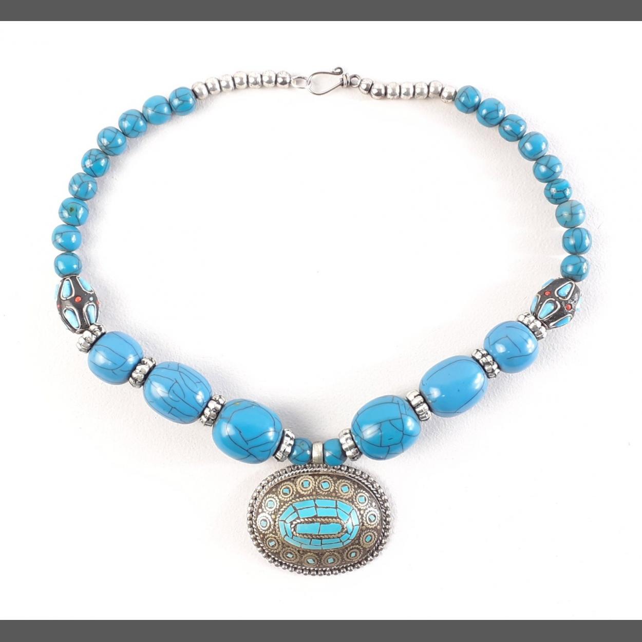 Turquoise bead and pendant necklace. Unmarked but beautiful design and an appealing piece. 46cm approx necklace, pendant is a hefty 5cm across.