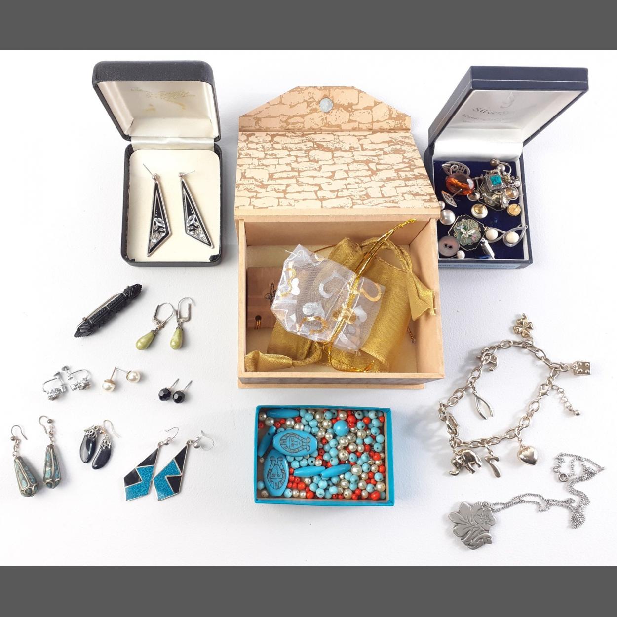 A lovely small collection of interesting small jewellery pieces to include unstrung beads, earrings, gilt charms, Whitby Jet bar brooch and others.