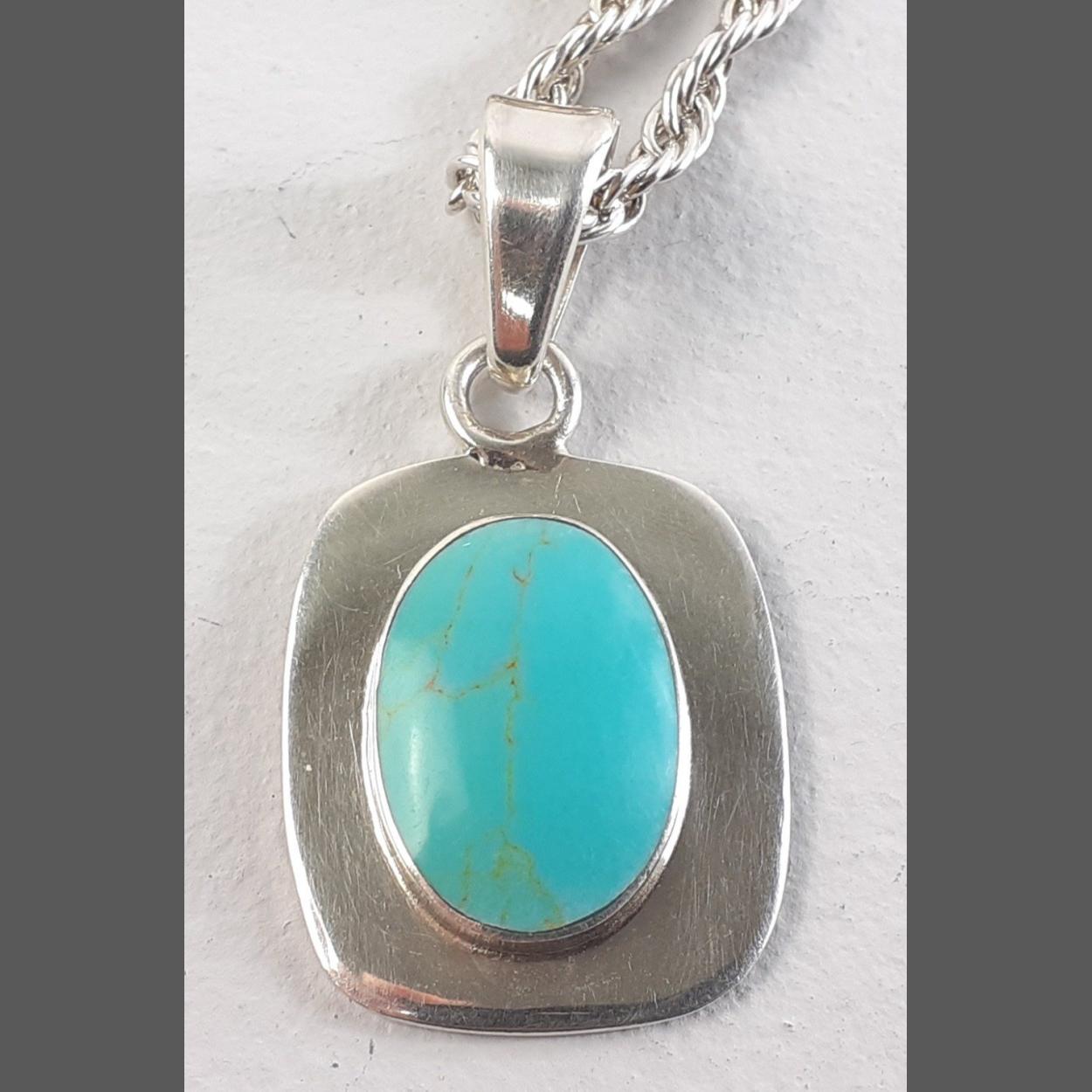 Mexico 925 Silver stamped oval turquoise stone on matching chain. Pendant 4cm including suspension. Total gross weight 22.3g approx