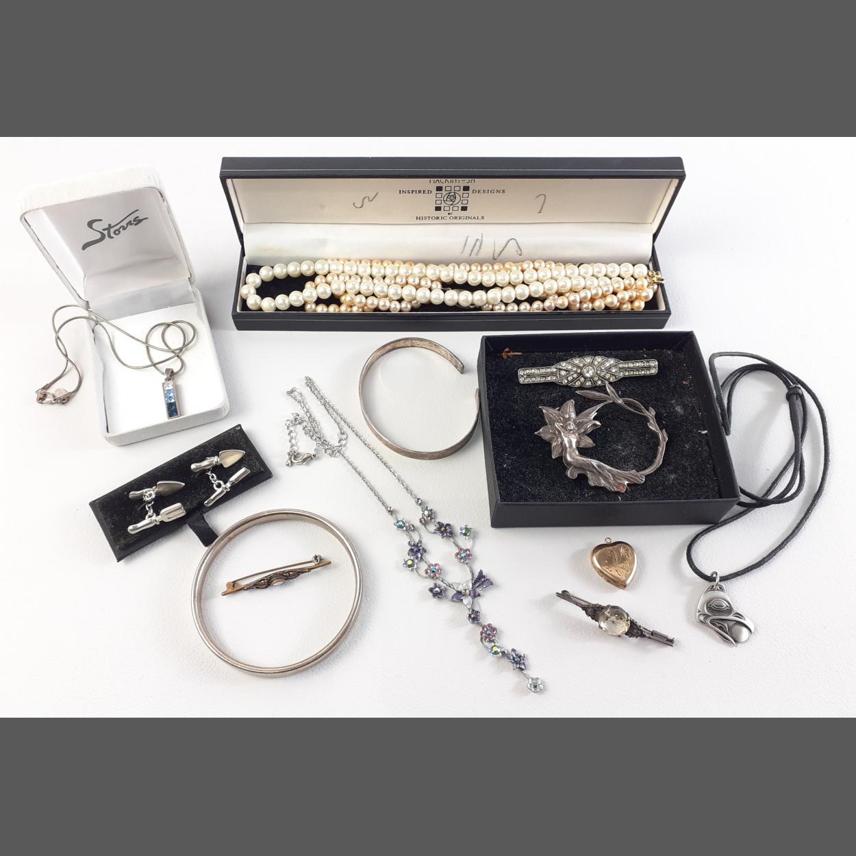 Pretty little jewellery lot consisting of bar brooches, two strings of pearls, pretty floral necklace, rolled gold locket, bangles. With a very stylish Art Deco style brooch.