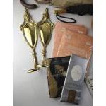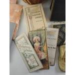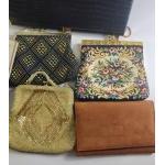 A mixed lot of interesting items to include rolled brollies, vintage tights / stockings, a muff, various handbags, small wicker basket, gloves and much else