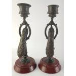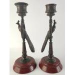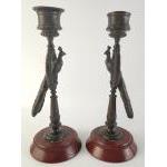 Unusual and stylish heavy cast candlesticks depicting peacocks on stand. Each approx 19cm tall. Believed Russian albeit appear unmarked. One missing sconce top.