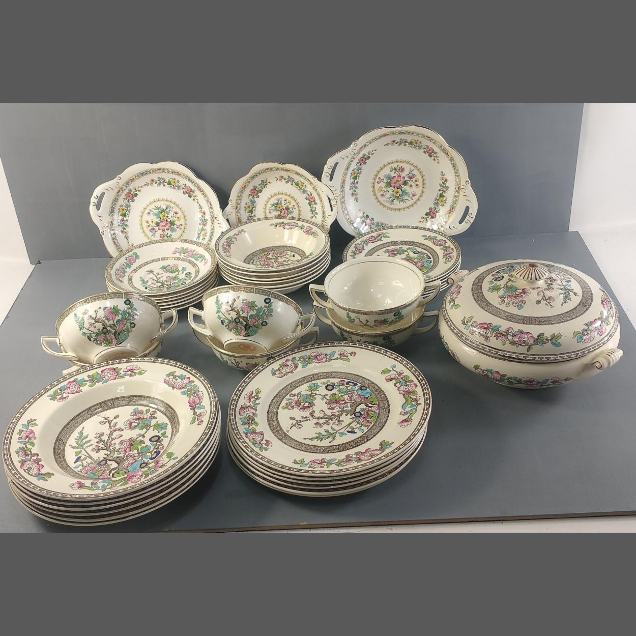 YE OLDE INDIAN TREE assorted dinner service pieces by BRIDGEWOOD. Service consists of lidded tureen, six 23cm plates (one noted with chip), six 23cm bowls, six 17cm plates, 17cm bowls and others.
