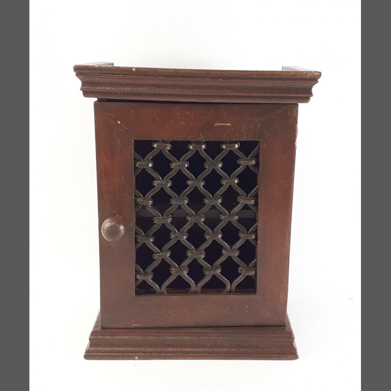 Handy small desktop shelved, pierced fronted cabinet. 35cm x 26cm x 16cm approx. Handy and stylish.