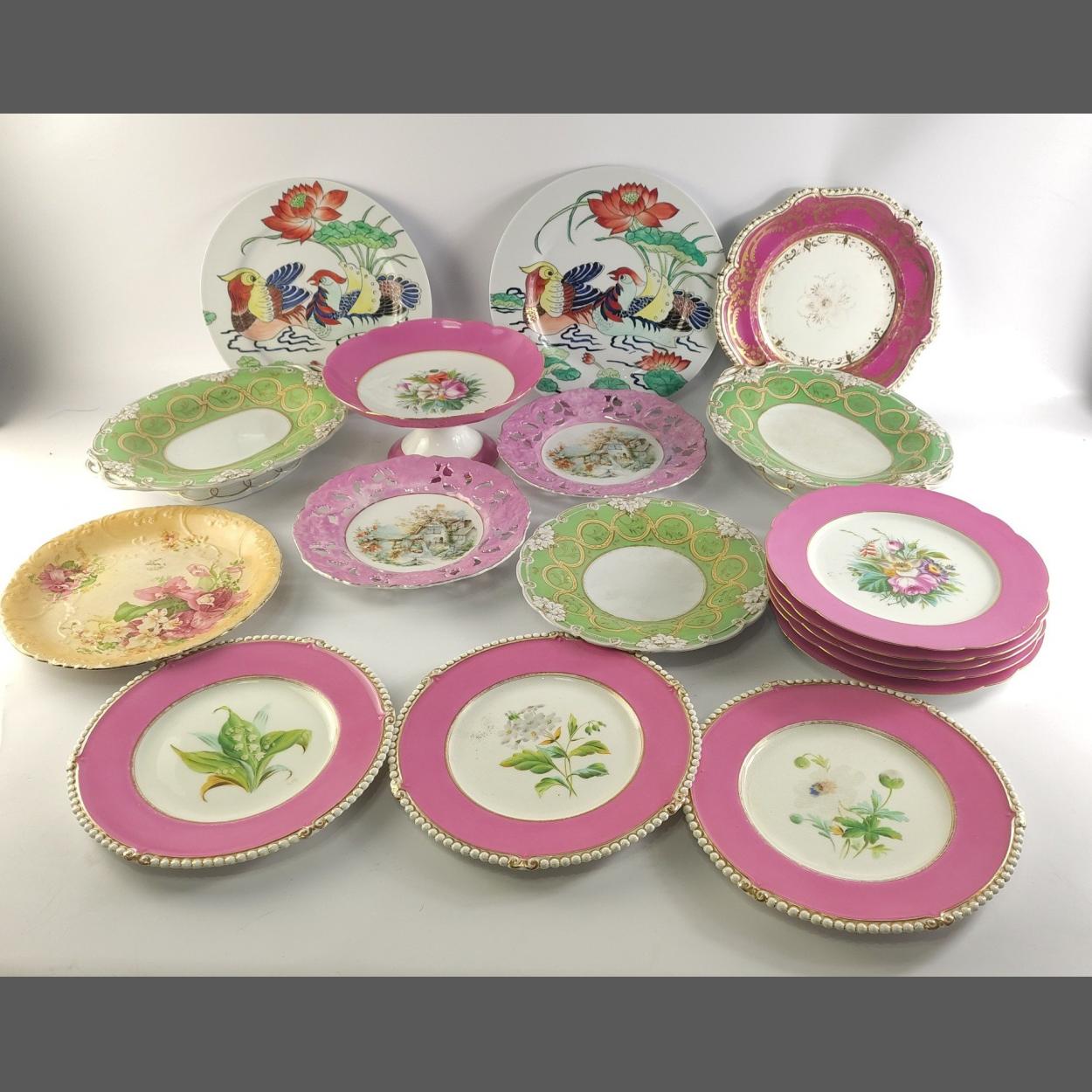 A box of mixed ceramics to include highly decorative wall plates and others. With two decorative tazzas and a compote.