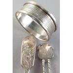 Silver teaspoon with golfing inscription for CARDROSS Golf Club 1957, with one other teaspoon inscribed ANGUS and a silver hallmarked napkin ring. Total 50g approx.