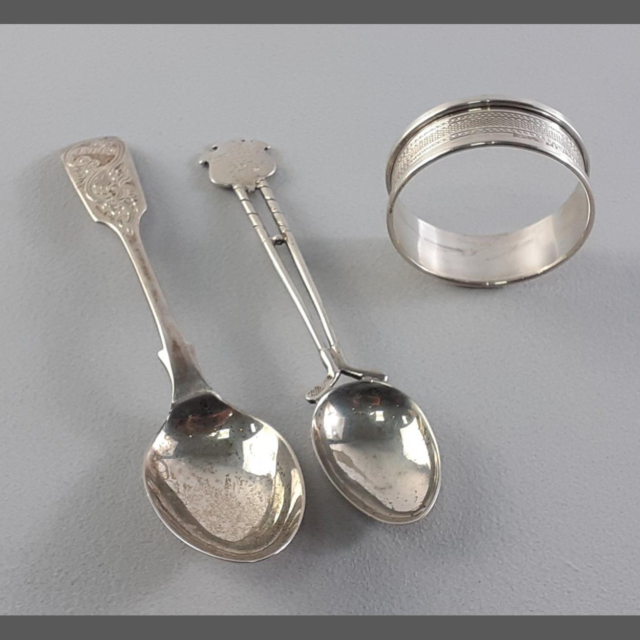 Silver teaspoon with golfing inscription for CARDROSS Golf Club 1957, with one other teaspoon inscribed ANGUS and a silver hallmarked napkin ring. Total 50g approx.