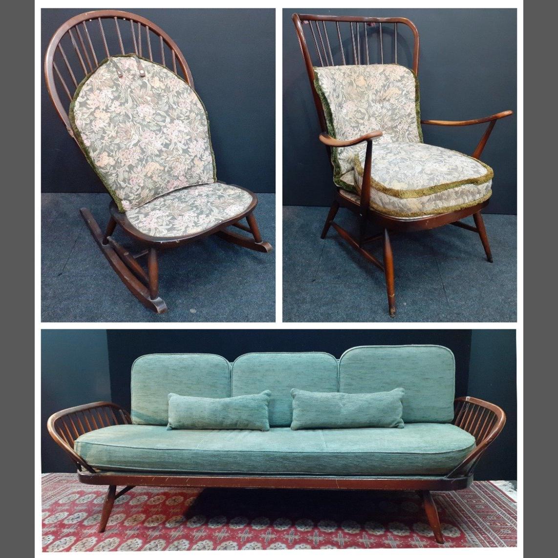 ERCOL Windsor furniture collection to include rocking chair (restoration required), an armchair in good useable condition and a superb sofa.