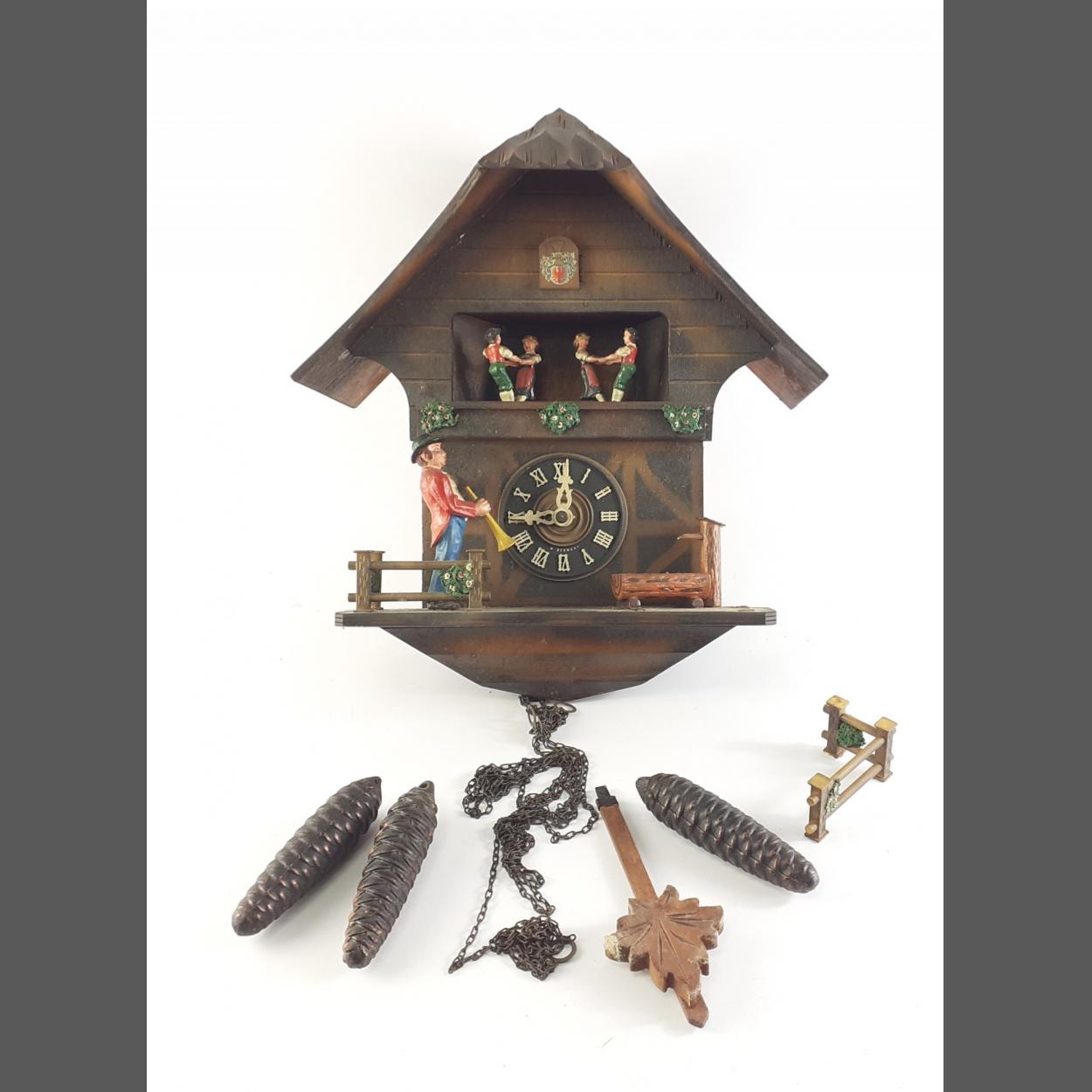 A West German wooden CUCKOO CLOCK with figures. With pendulum and weights. 35cm approx.