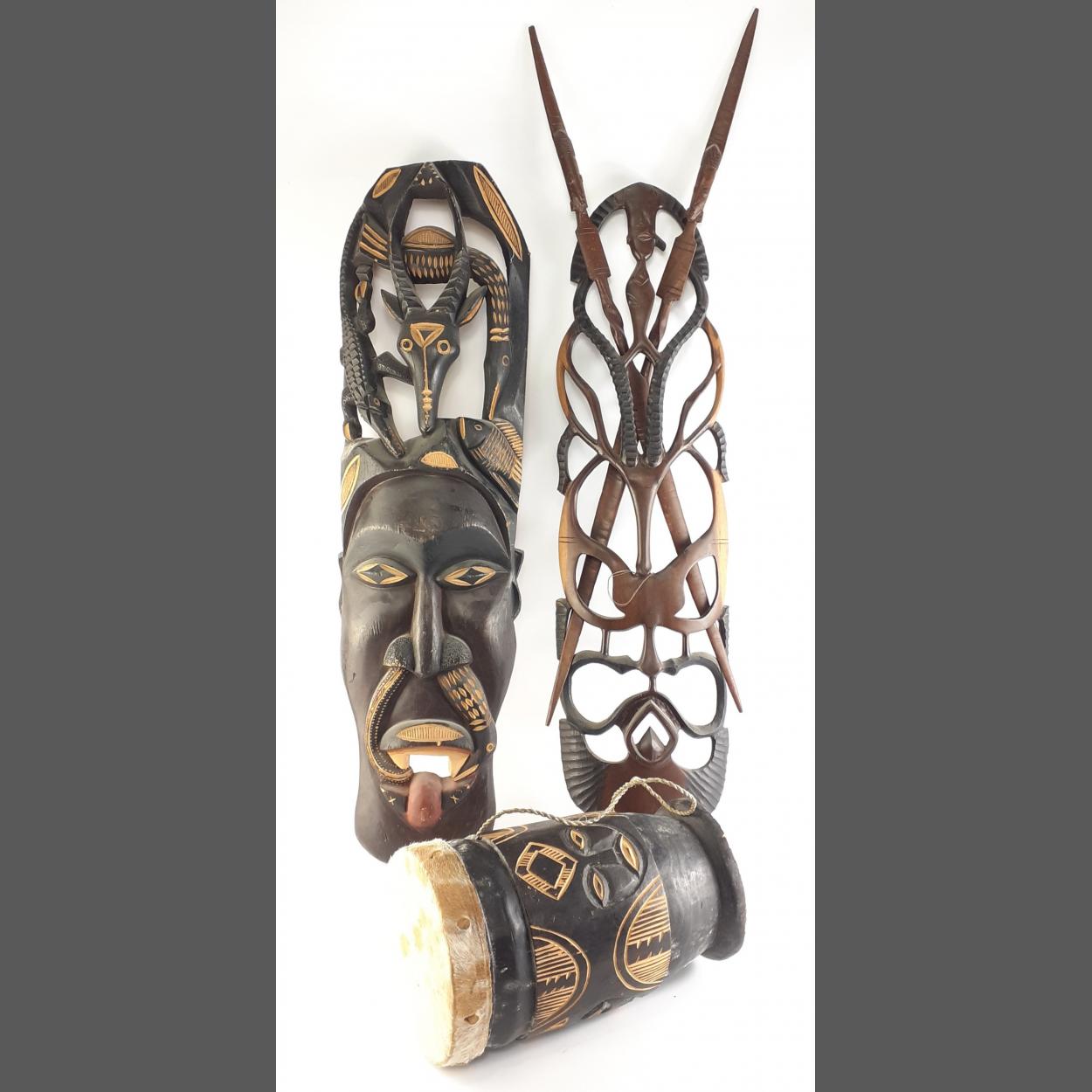 An African tribal drum and two masks