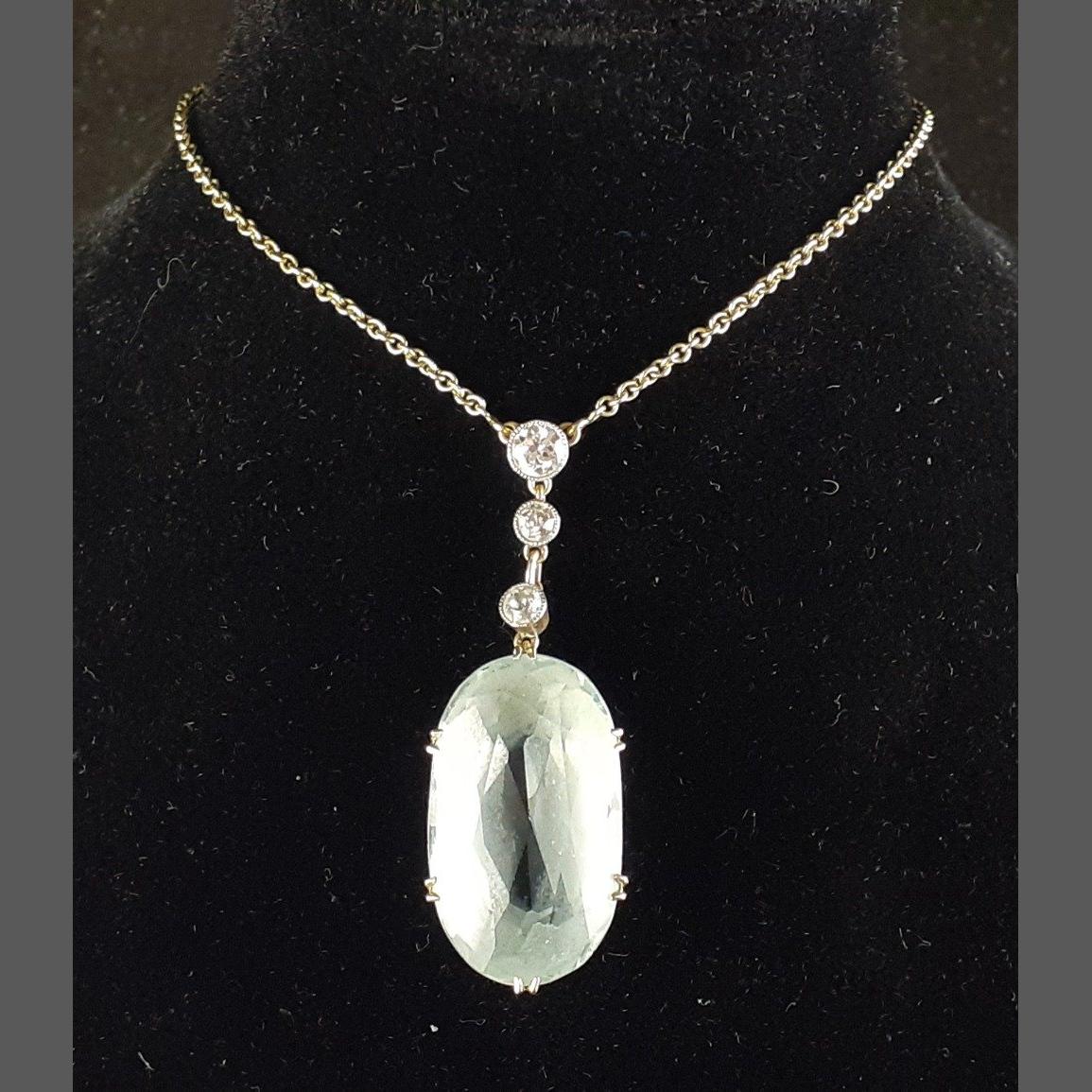 An unmarked yellow metal mounted polished 20mm aquamarine stone set with three diamonds (tested) to neck. The largest diamond 3mm approx. Gross weight 6.7g approx. A jeweller’s pattern number OXI -8090 noted to the side of the mount, otherwise unmarked.