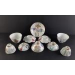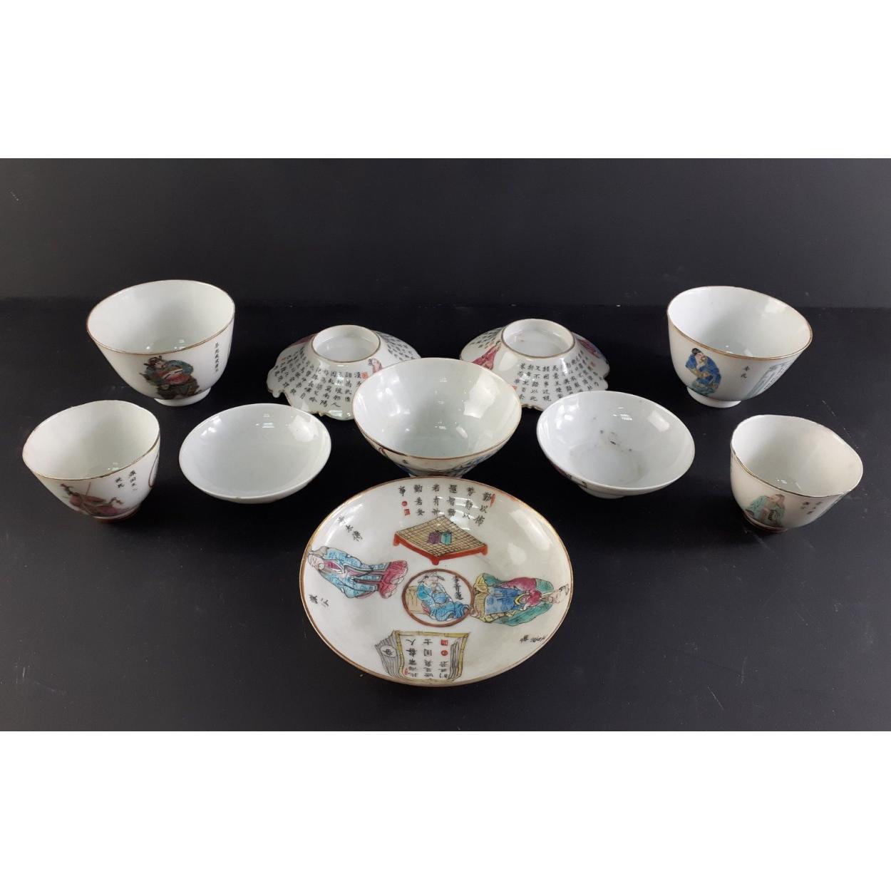 Antique Chinese tableware pieces to include soy bowls on pedestals, small cups and a saucer etc.