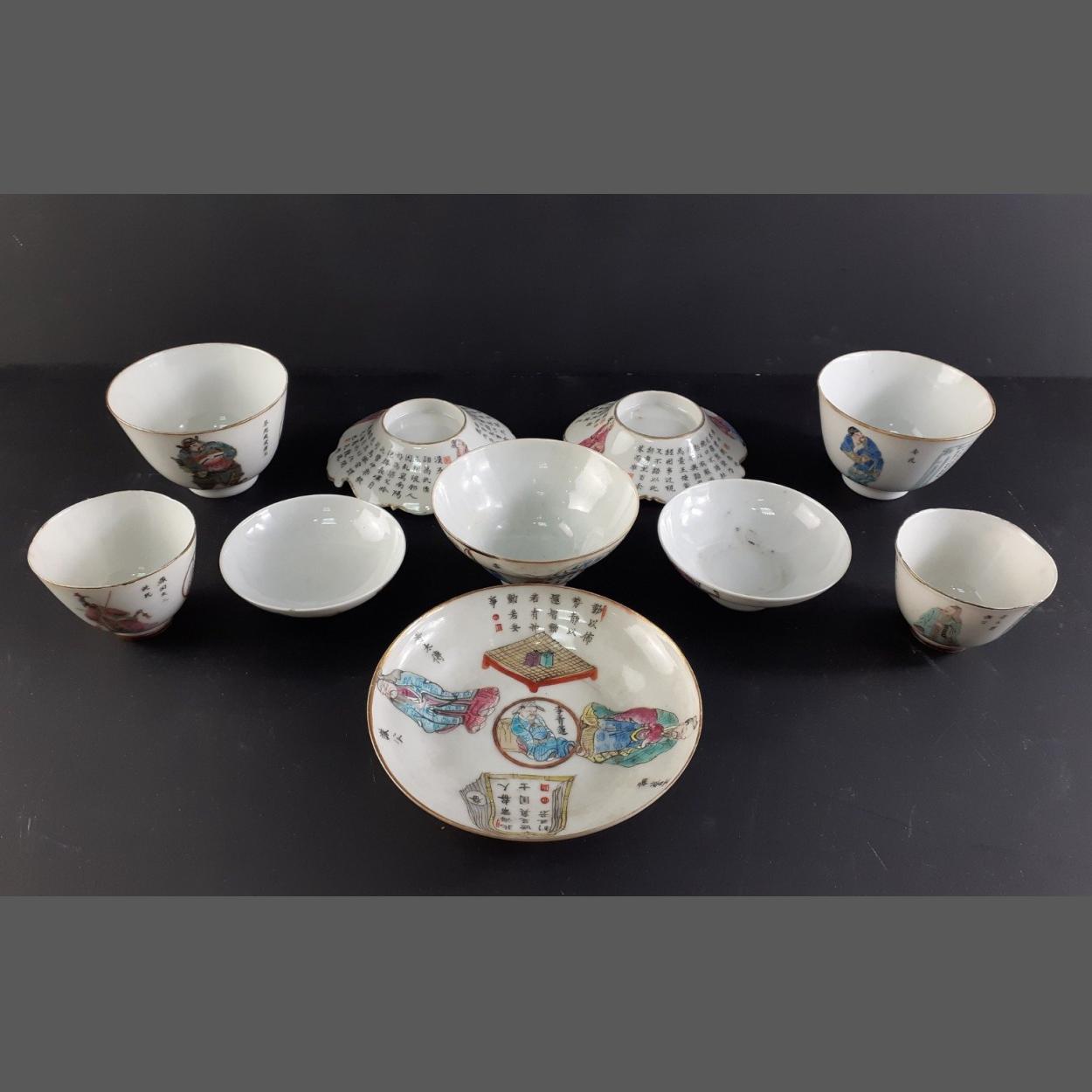 Antique Chinese tableware pieces to include soy bowls on pedestals, small cups and a saucer etc.