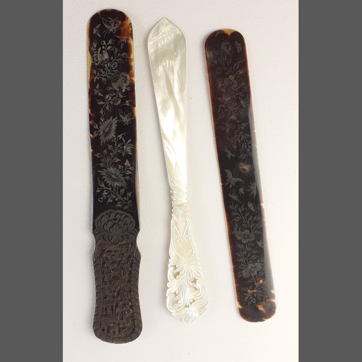 Three antique page turners. One Mother of Pearl, two turtle shell. All in good condition.