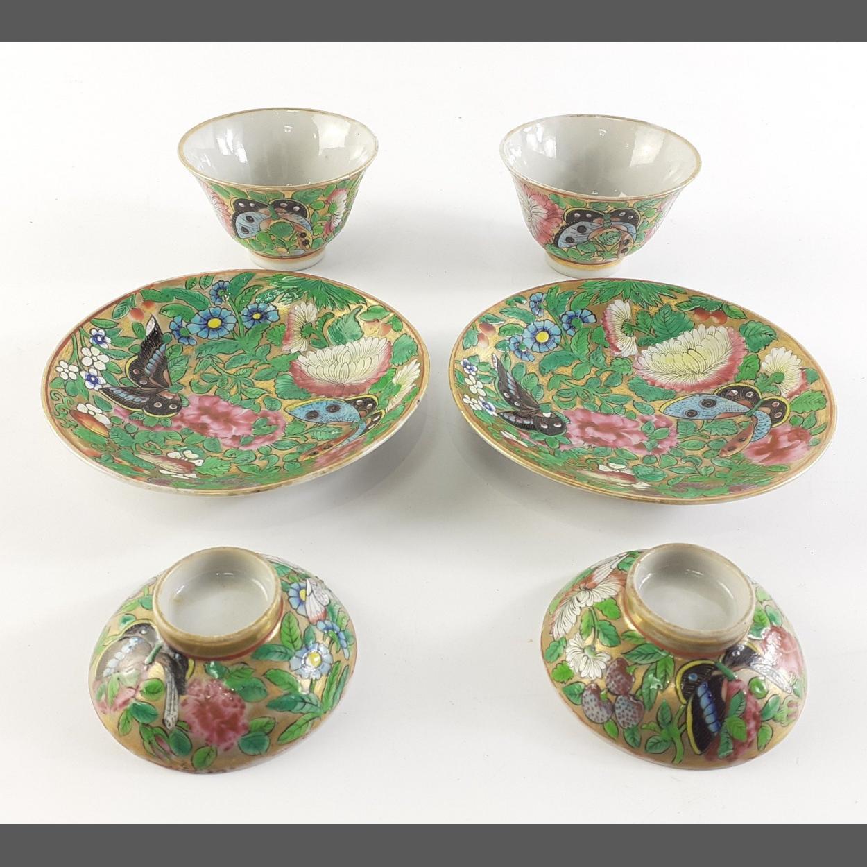 Antique Chinese saucers tea cups and soy bowls in good condition. Six pieces. the saucers 10cm approx.