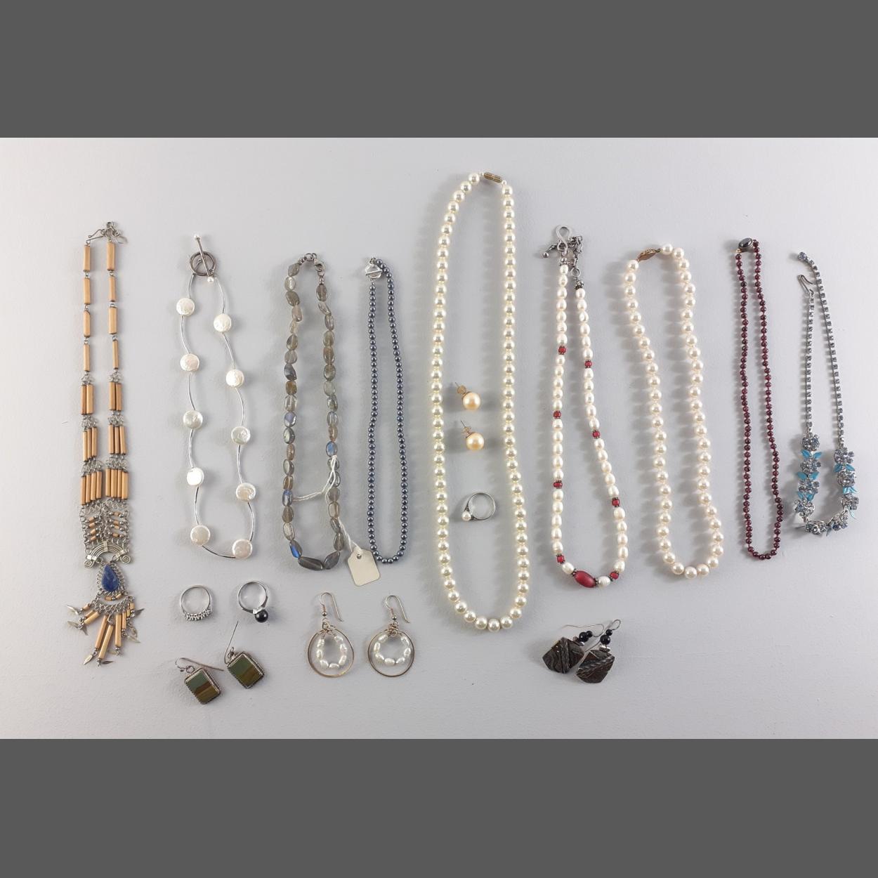 Nice bag of interesting jewellery, includes beads, earrings, red beads with 925 stamped clasp, silver ring etc.