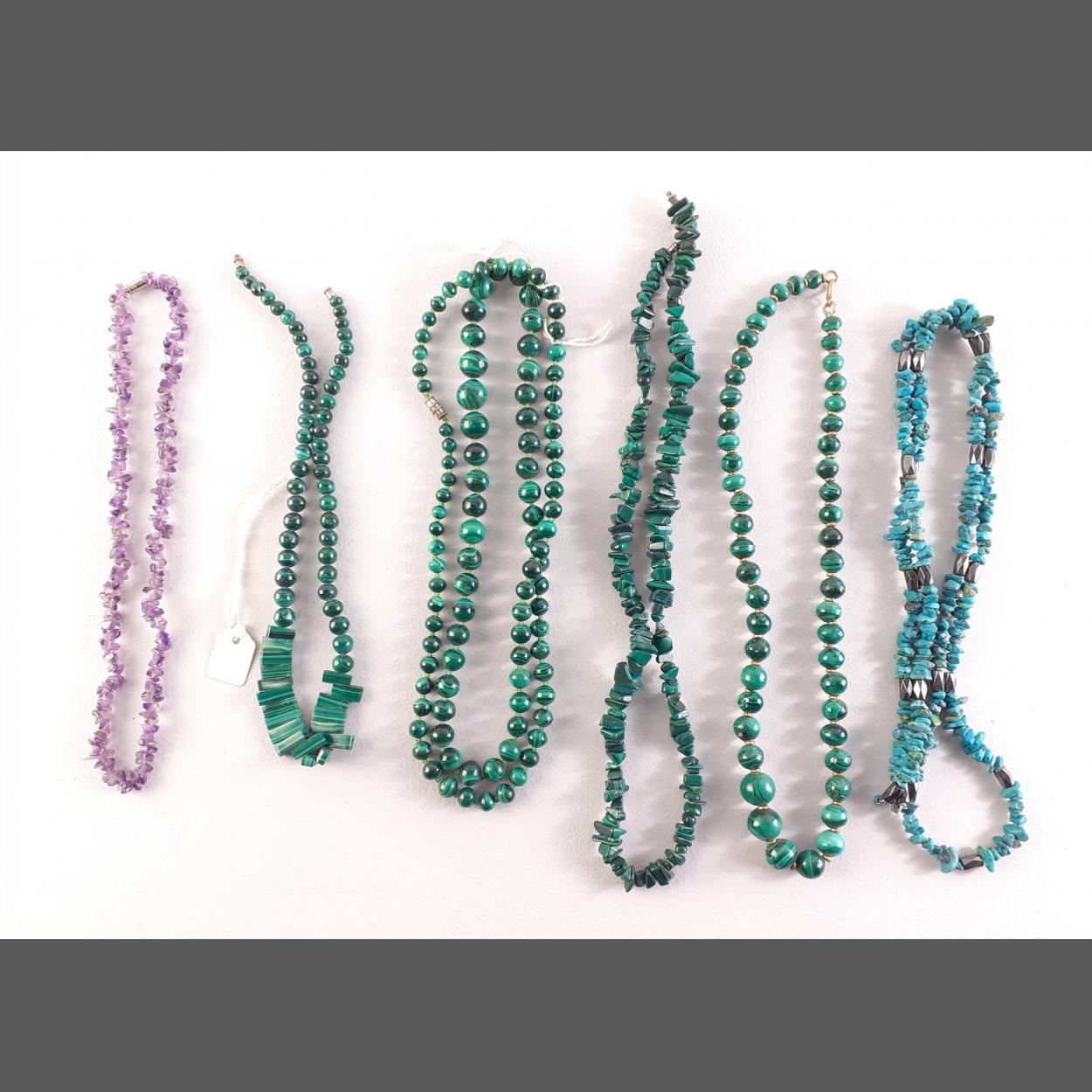 Five Malachite and other green stone necklaces with one rough cut amethyst necklace. Stylish classy pieces.