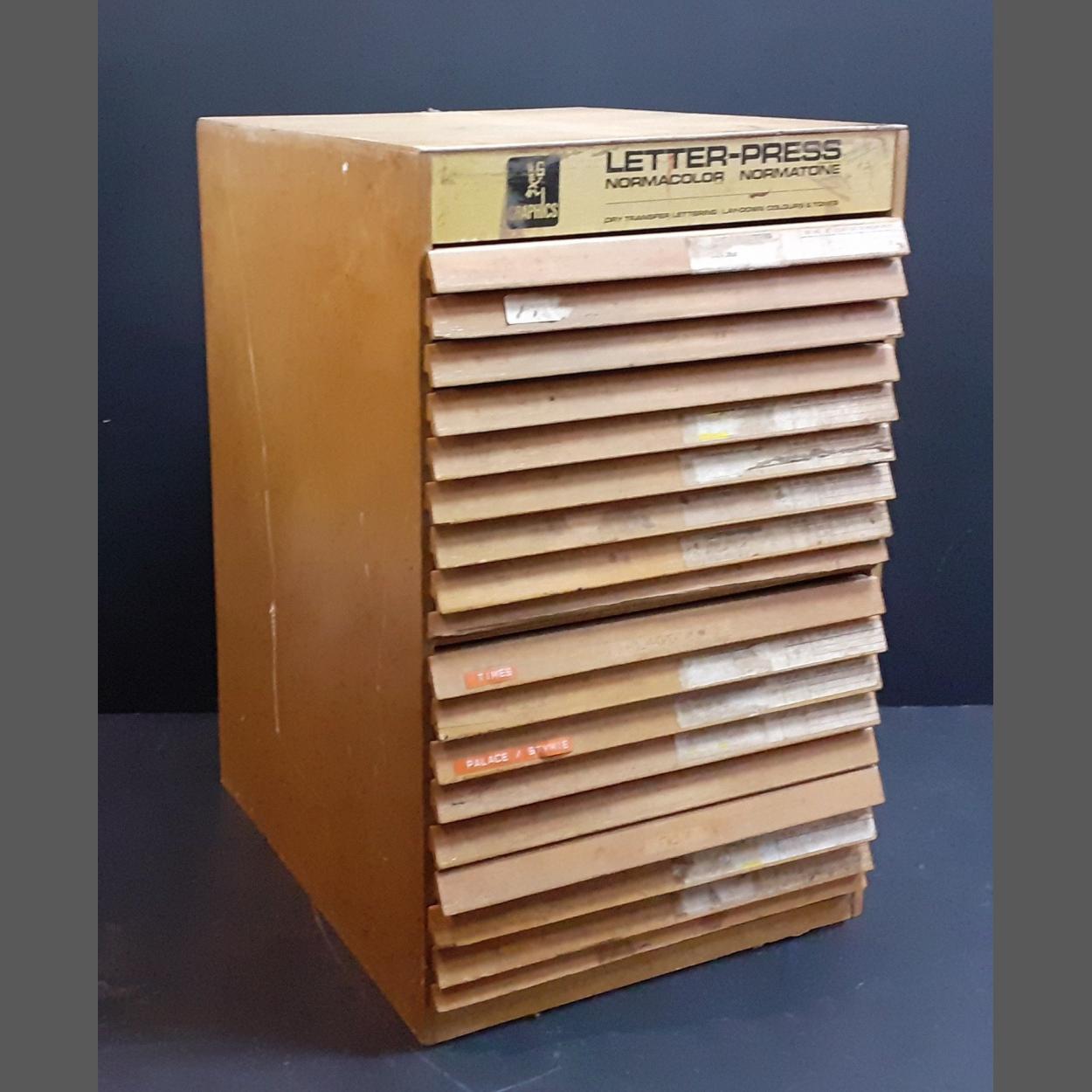 A super LETTERPRESS wooden 17 drawer storage box with a selection of low denomination coinage mainly obsolete UK, containing 1971, 1980 and 1986 uncirculated sets,