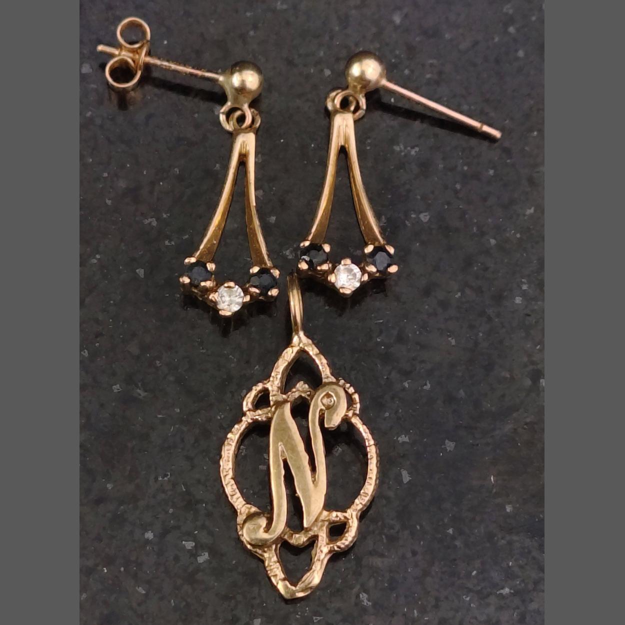 A pair of stamped 9k earrings with blue and white stones, gross weight 1.19g approx - with a 375 stamped pendant weight .90g approx