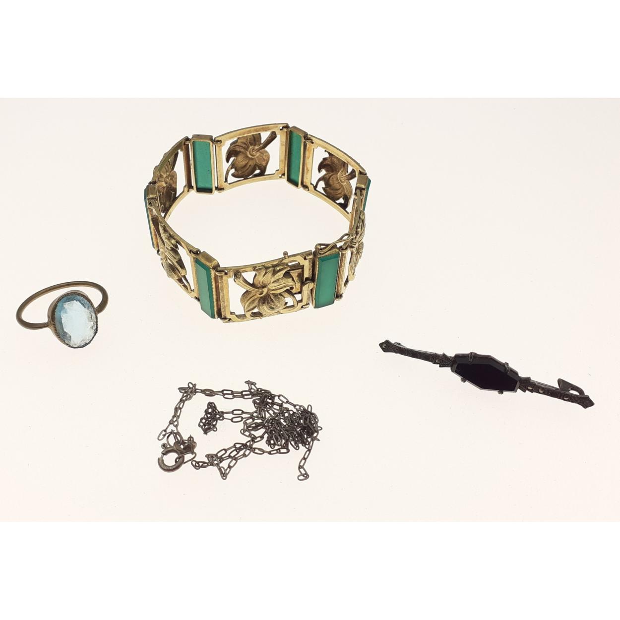 A bracelet set with green stones plus a pin brooch and a ring set with blue stone.