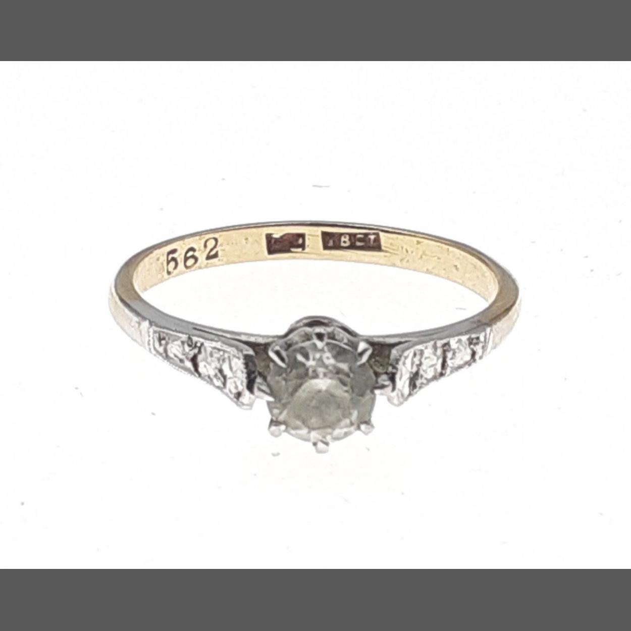 An 18ct stamped ring set with centre diamond (tested) 4mm stone. Size N, gross weight 2.3g approx