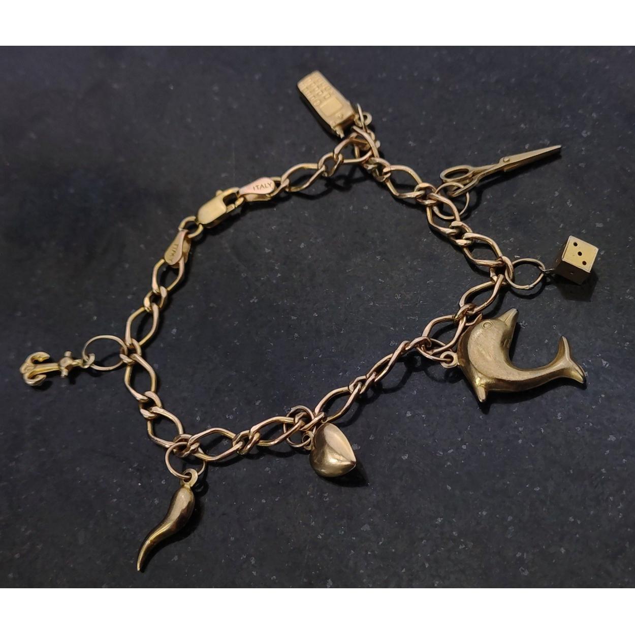 Fully hallmarked 9ct gold ITALY chain with seven unmarked charms, Anchor, Chilli, Heart, Dolphin, Dice, Scissors, Mobile Phone. Total gross weight 5g approx