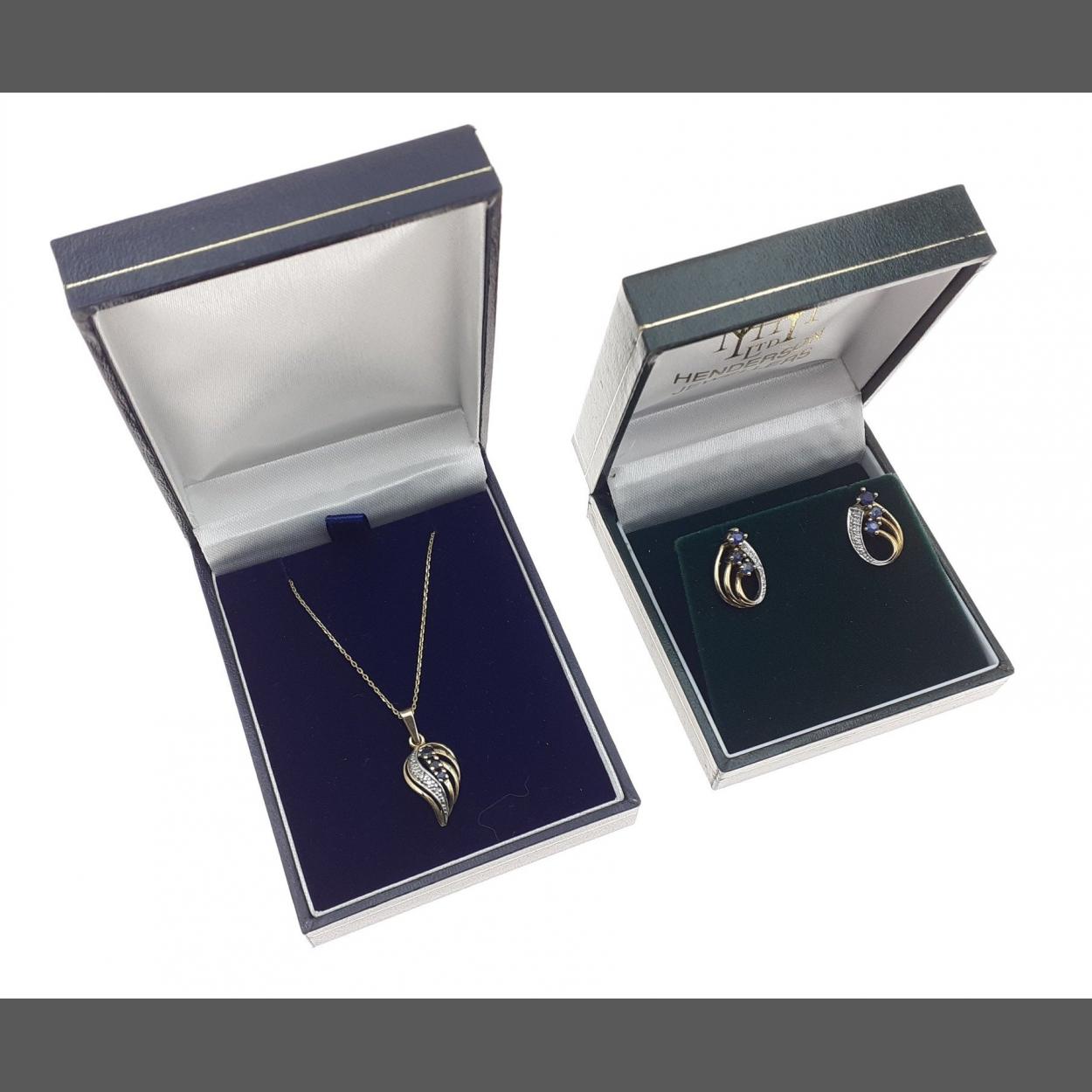 Beautiful 375 stamped pendant and earring set each with sapphires and small diamond chips. Gross weight 4.7g approx