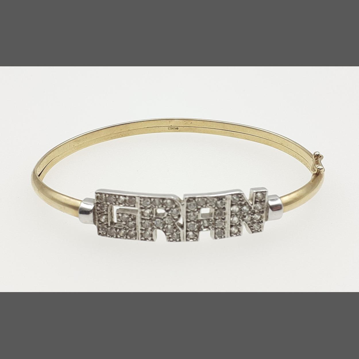 A 375 stamped bangle with central GRAN picked out in clear white stones. A lovely sentimental BLING! piece. Gross weight 7.9g approx
