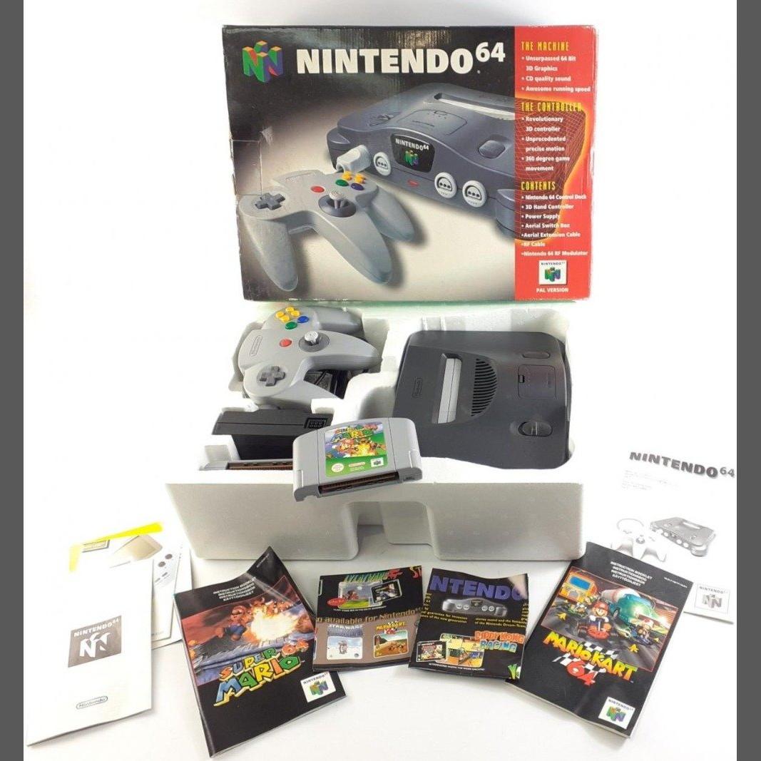 NINTENDO 64 in box with MARIO KART and SUPER MARIO BROS. with cables etc.